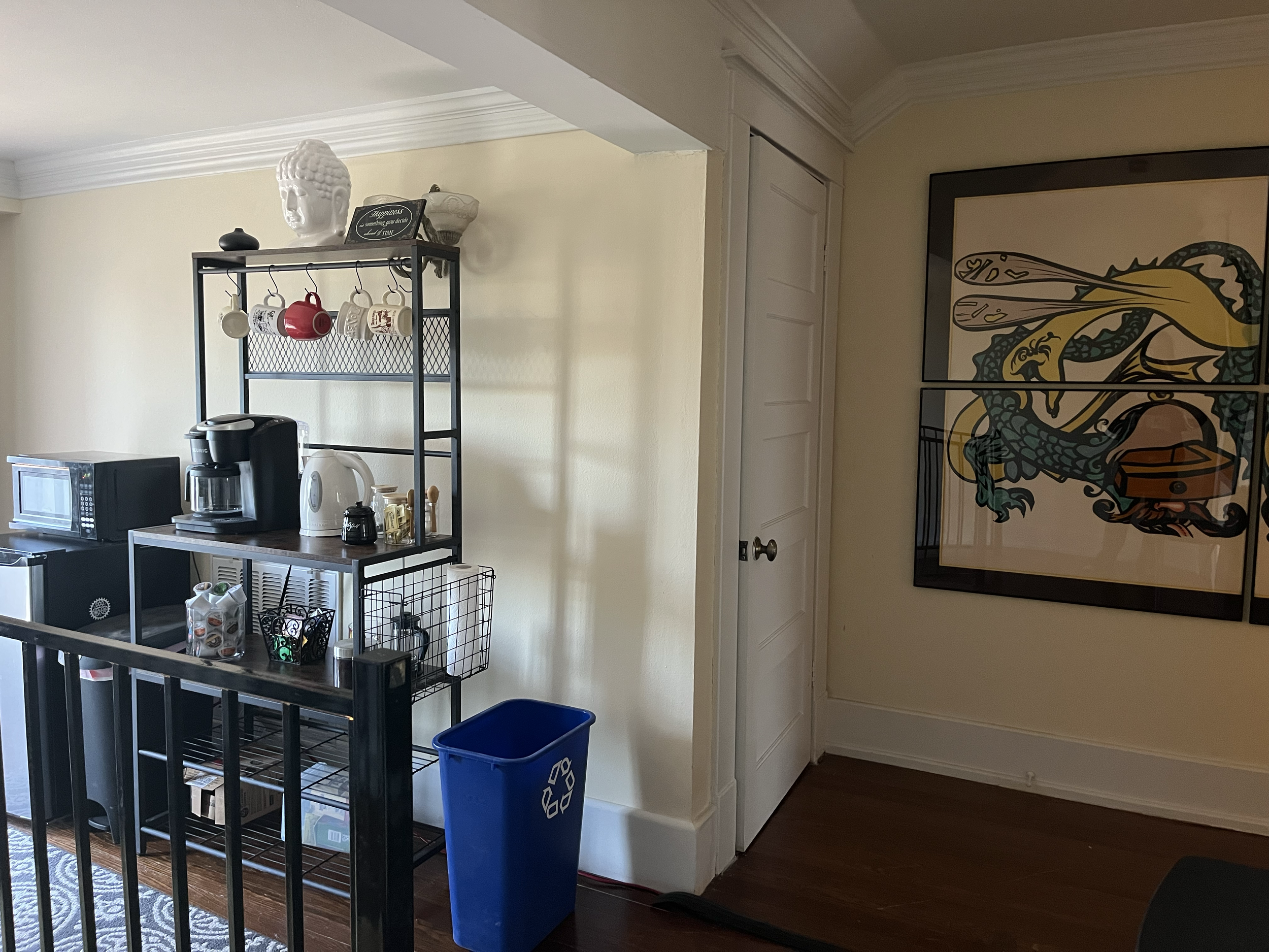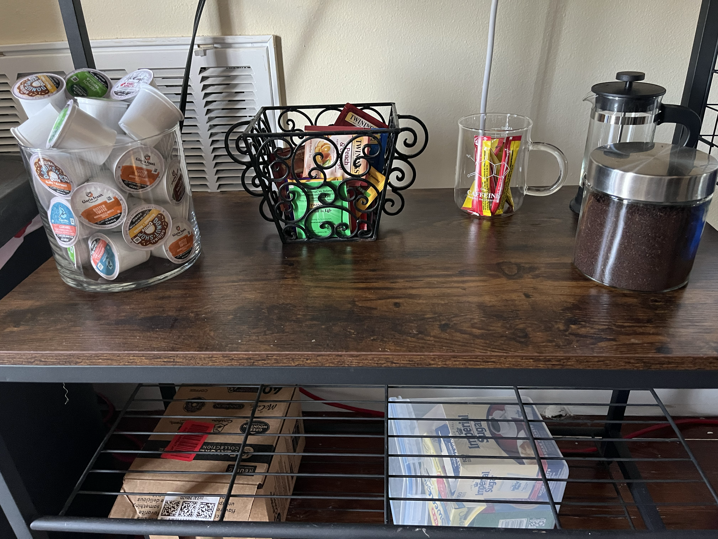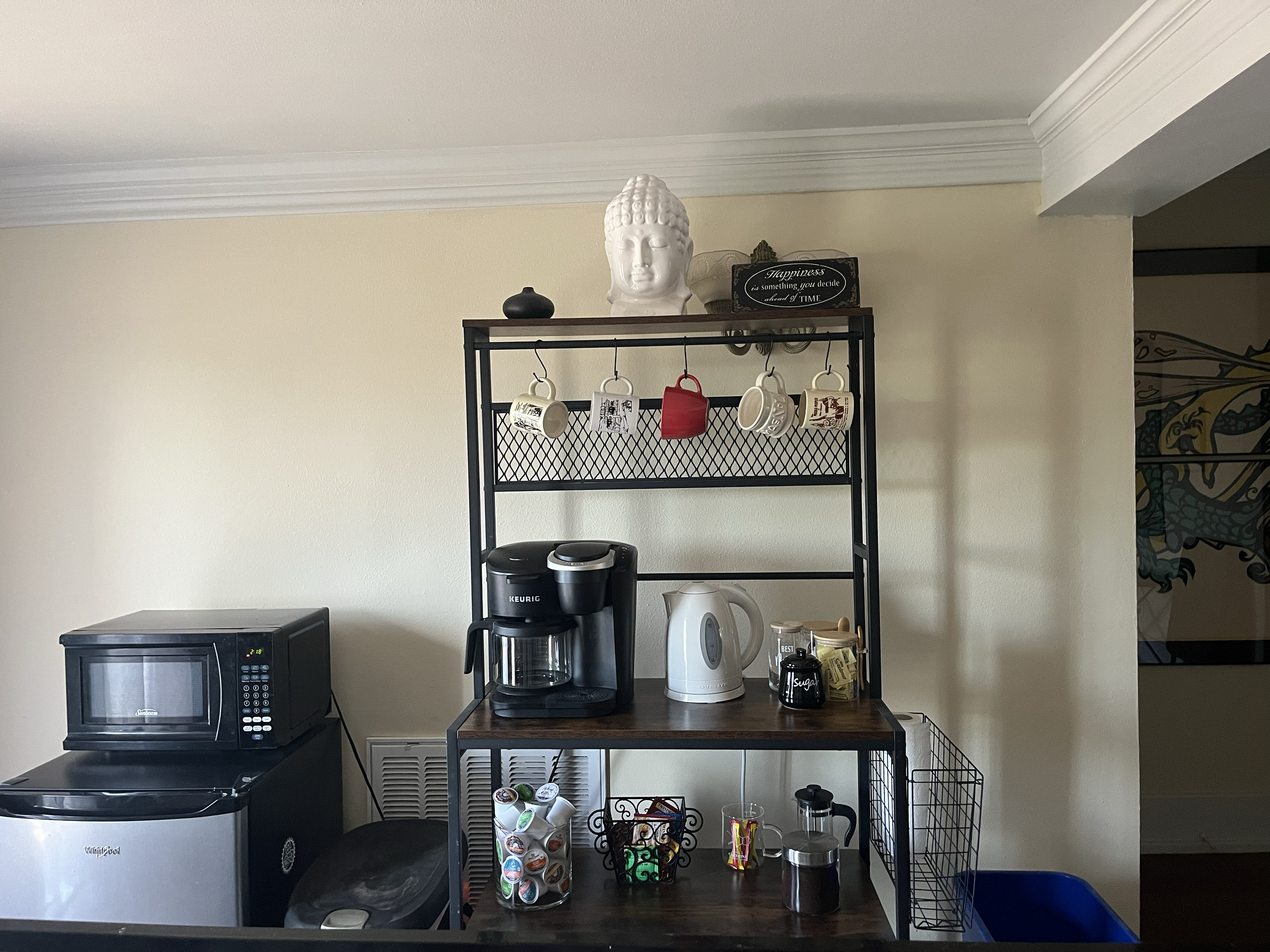 Guests on the top floor enjoy exclusive access to their own private coffee bar, complete with a Keurig, French press, tea kettle, microwave, and dorm-style refrigerator… perfect for quiet mornings or late-night winddowns.